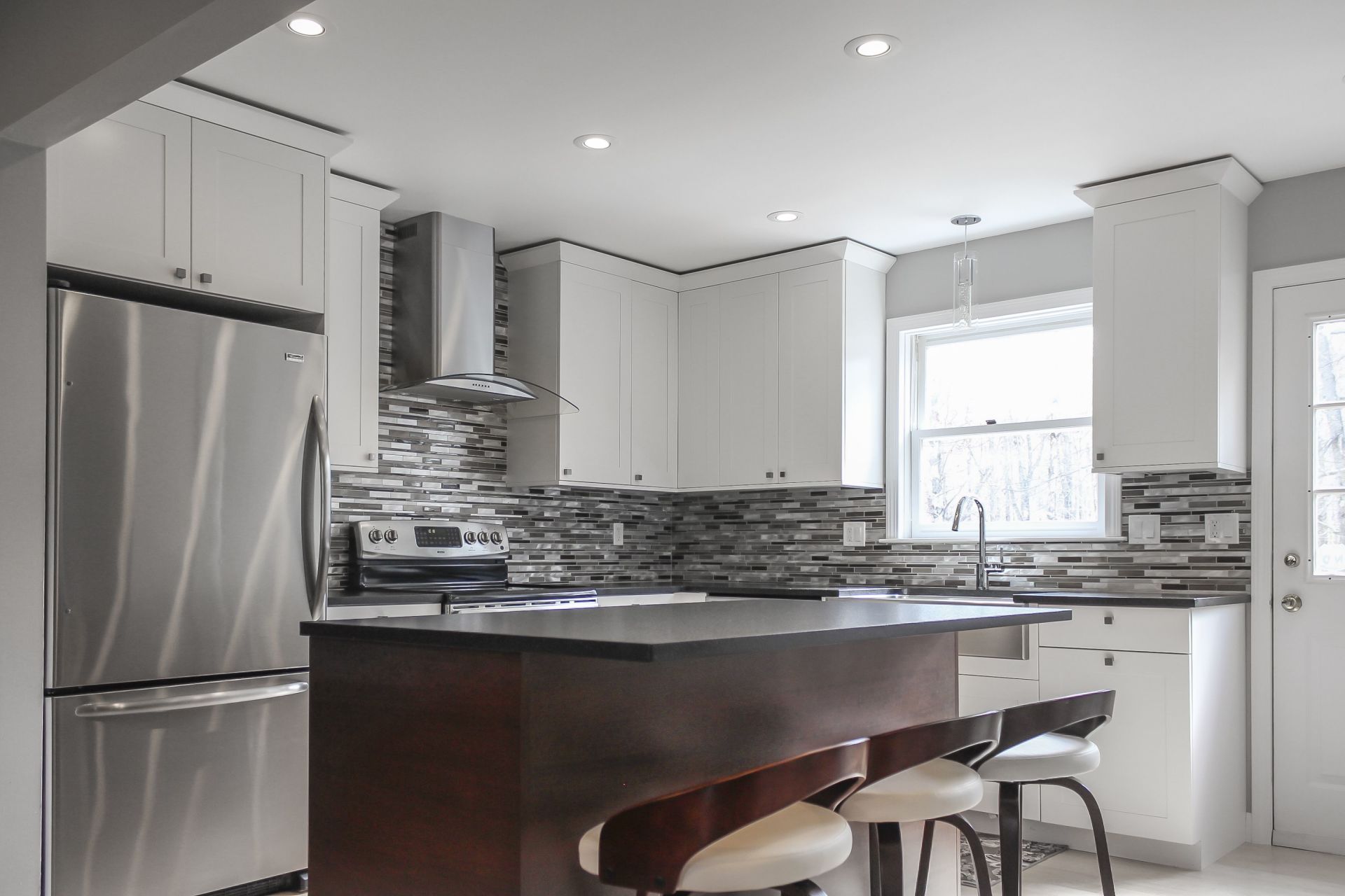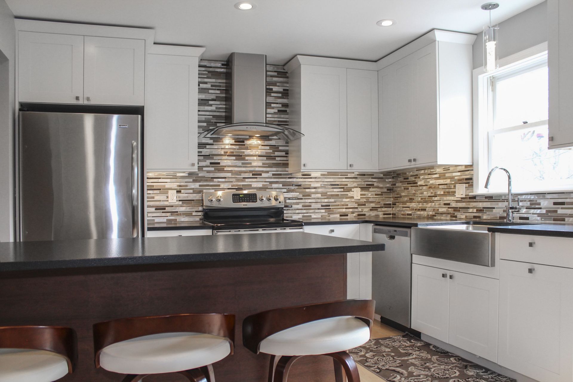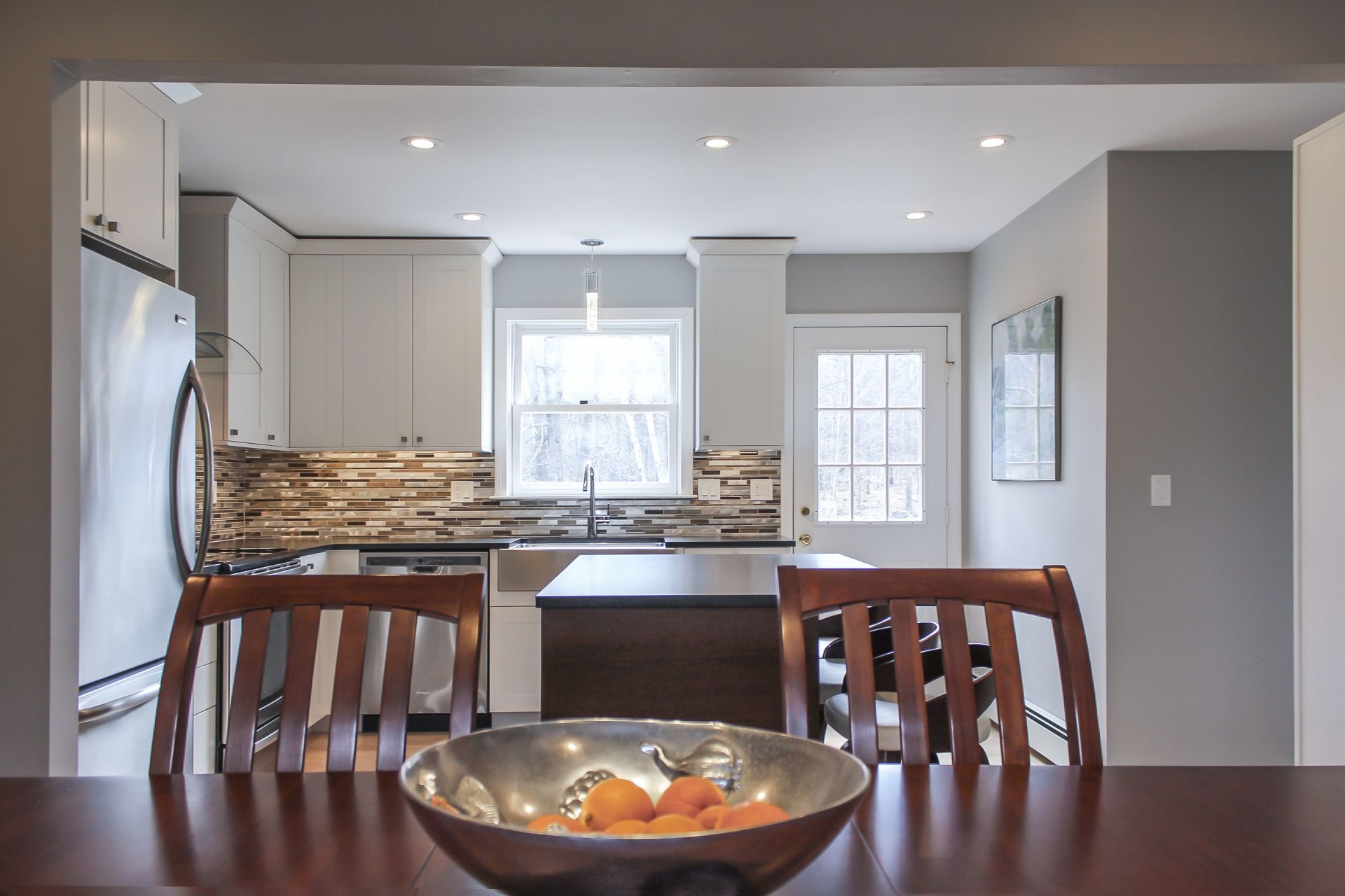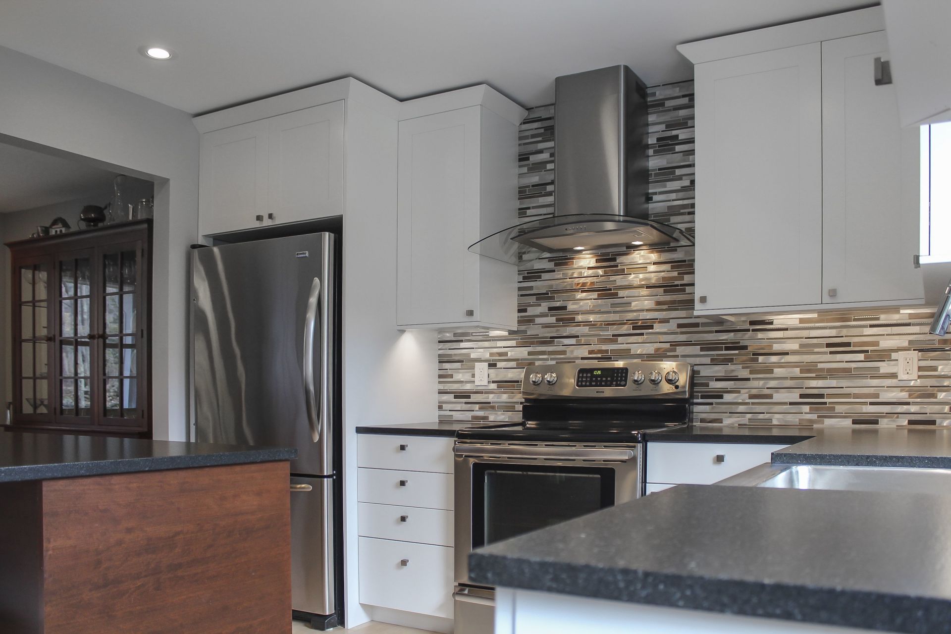 Home to an avid French cook and busy family, we helped maximize the use of the space, while keeping the workflow clean for entertaining. White shaker doors, frameless construction, leathered countertop finish, custom island, under-cabinet lighting, and other creative touches give this kitchen an elegant look and feel.
